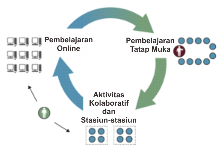 Pada model ini pembelajaran bisa dimulai dengan stasiun tatap muka dimana guru menjelaskan konsep dasar tentang suatu materi dan langkah-langkah menyelesaikan tujuan pembelajaran. Selanjutnya dilanjutkan dengan stasiun-stasiun aktivitas kolaboratif antar siswa atau kelompok-kelompok kecil, di sini siswa bebas bergerak antar stasiun. Proses selanjutnya adalah pembelajaran online dimana siswa bisa mendapatkan informasi tambahan dan sumber-sumber belajar lain yang mendukung pembelajarannya, siswa juga bisa kembali ke stasiun kolaboratif untuk memperbaiki atau melengkapi pembelajaran mereka. Pembelajaran akan diakhiri dengan tatap muka lagi untuk membahas berbagai hal termasuk evaluasi, assessment, dan pembahasan-pembahasan tingkat tinggi.