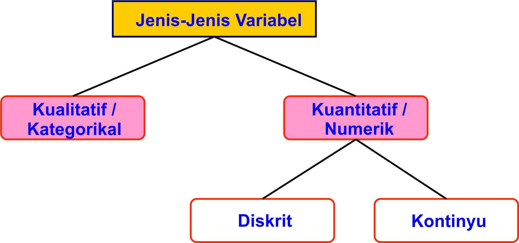 Pada dasarnya variabel bisa digolongkan menjadi dua yaitu variabel kualitatif dan variabel kuantitatif. Variabel kualitatif juga disebut variabel kategorikal memiliki nilai yang hanya dapat ditempatkan ke dalam kategori seperti ya dan tidak. “Apakah Anda seorang?” (Ya atau tidak) dan nilai ujian matematika Anda (di bawah rata-rata, rata-rata, atau di atas rata-rata) adalah contoh dari variabel kategori. Sedangkan variabel kuantitatif atau numerik memiliki nilai yang mewakili kuantitas. Variabel numerik dibedakan lagi menjadi variabel diskrit dan variabel kontinyu.