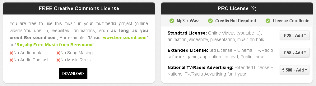 Berikut ini adalah contoh keterangan materi audio. Dalam gambar di bawah ini ada keterangan penggunaan audio yang bebas anda gunakan untuk mendukung media pembelajaran anda asal mencantumkan atribut pemilik lisensi dalam cantoh ini adalah “Bensound.com”. Bila anda tidak mau mencantumkan atribut pemilik lisensi anda bisa membeli lisensi dengan pilihan harga yang ada di bagian gambar sebelah kanan.
