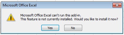 - Bila muncul peringatan bahwa Microsoft Office Excel tidak bisa menjalankan add-in ini berarti memang waktu instalasi dulu belum dimunculkan dan belum pernah menggunakan add-in ini. Pada pertanyaan apakah anda ingin menginstall sekarang? Maka klik “Yes”.