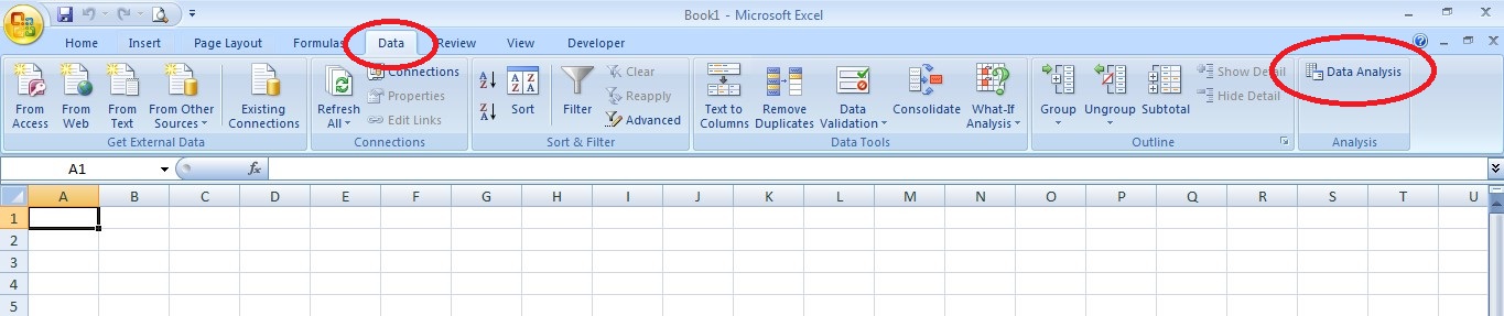 Baiklah, langsung saja kita mulai dengan bagaimana memunculkan tool ini pada kelompok toolbar DATA. Seperti kita lihat pada gambar di bawah ini dalam kelompok toolbar DATA tidak ada tool analisis. Untuk memunculkannya ikuti langkah-langkah berikut: