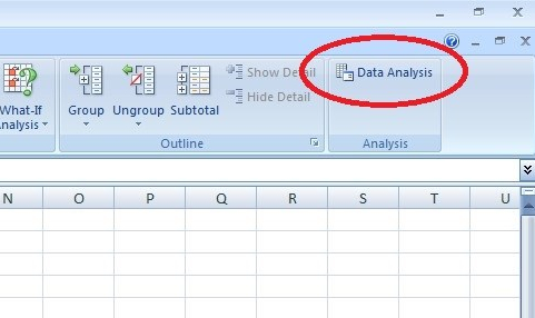 - Setelah selesai tool Data Analysis akan muncul di bagian paling kanan kelompok menu DATA. Seperti pada gambar di bawah ini.