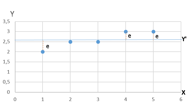 Y’ merupakan estimasi dari nilai Y dengan metode rata-rata. Sedangkan e adalah error term yaitu selisih antar nilai estimasi (Y’) dengan nilai sebenarnya (Y). bila digambarkan dalam grafik adalah sebagai berikut: