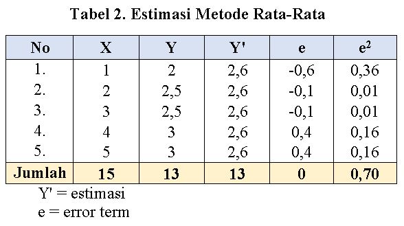 Estimasi rata-rata adalah estimasi yang sangat sederhana, dimana kita hanya cukup merata-rata setiap nilai Y tanpa memperhatikan nilai X. Dengan demikian rata-rata dari Y adalah 13 dibagi 5 sebagai jumlah data sehingga hasilnya adalah 2,6. Selengkapnya lihat tabel di bawah ini.