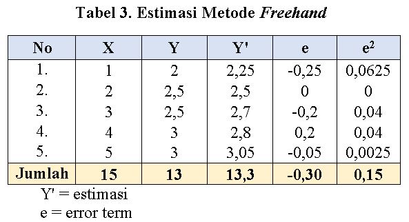 Bila kita bandingkan dengan hasil estimasi metode freehand ini dengan metode rata-rata, manakah yang lebih baik?. Hasil estimasi yang paling baik bisa dilihat dari nilai error term-nya. Ya, error term atau selisih antara estimasi dan kenyataannya. Tentunya nilai error term (e) yang paling kecil yang lebih baik. Nilai e pada tabel 2. dan tabel 3. akan kita bandingkan mana yang lebih kecil?.