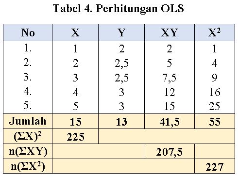 Dimana “a” adalah konstanta dan “b” adalah koefisien regresi atau slope (kemiringan garis tren). Nilai a dan b ini dapat kita peroleh melalui rumus Ordinary Least Square (OLS) sebagai berikut.