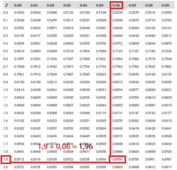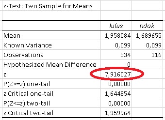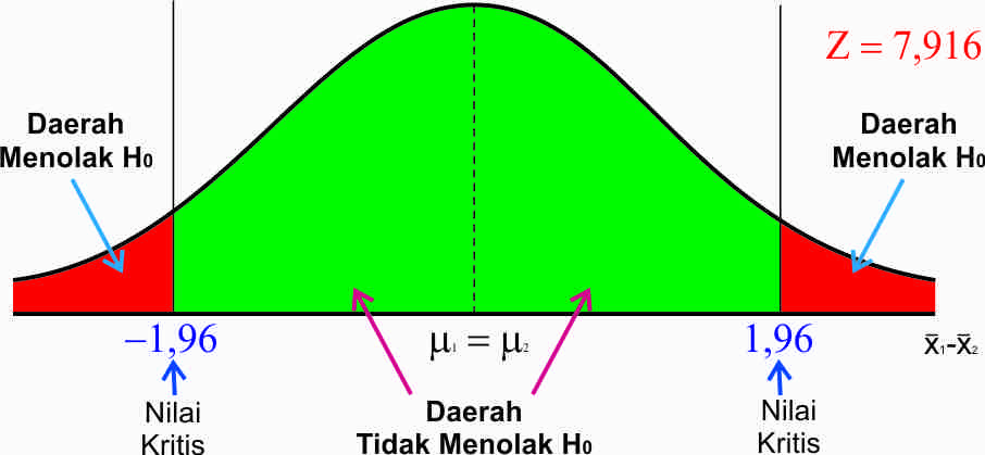 Hasil penghitungan menggunakan Excel di atas menunjukkan nilai Z sebesar 7,916. Menggunakan pendekatan nilai kritis dengan tingkat signifikansi 0,05, maka area ekor kiri adalah 0,025, dan daerah ekor kanan adalah 0,025. Menggunakan tabel distribusi normal kumulatif (0,9750) atau tidak kumulatif (0,4750) , nilai kritis bawah 0,025 sesuai dengan nilai Z -1,96, dan nilai kritis atas 0,025 sesuai dengan nilai Z dari +1,96, seperti yang ditunjukkan pada gambar berikut.