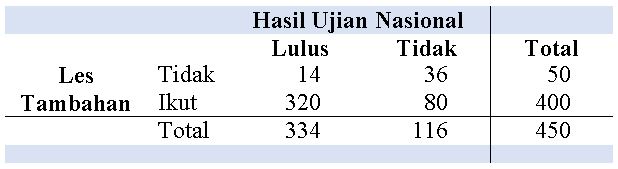 Tabel dua arah di bawah ini adalah rangkuman hasil penelitian yang mengamati hasil Ujian Nasional siswa di sebuah Sekolah Dasar. Tabel ini menyajikan data siswa “Lulus” atau “Tidak” dan apakah siswa itu mengikuti les tambahan.