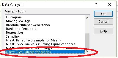 - Setelah muncul menu “Data Analysis” pilih “z-Test: Two Sample for eans” kemudian klik “OK”