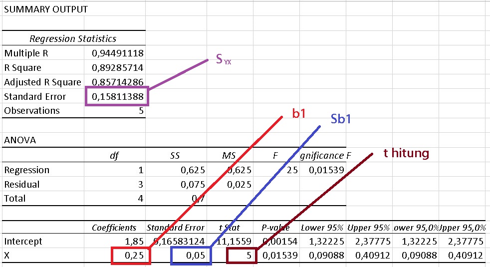 Berdasarkan output regresi ini kita bisa melihat nilai Syx sebesar 0,15811388. Bila ingin penjelasan lebih lanjut silahkan kunjungi link ini.
