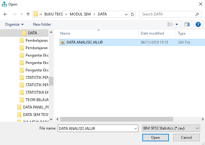 Selain itu juga bisa melalui tombol “Select Data File(s)” di kolom sebelah kiri program Amos.