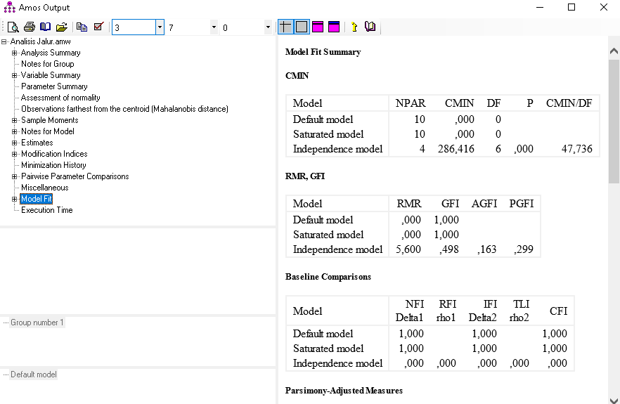 Ringkasan penghitungan parameter uji kesesuaian dapat dilihat di bagian “Model Fit” pada output teks di Amos. Anda hanya tinggal memilih kreteria apa saja yang akan digunakan.