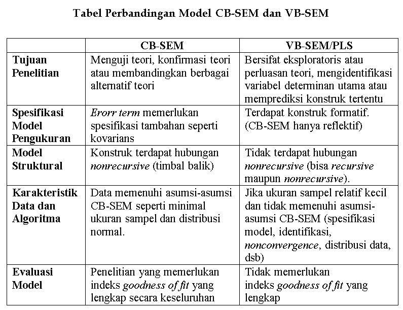 Penggunaan dua jenis SEM ini sangat tergantung pada beberapa hal misalnya tujuan penelitian, karakteristik data, dan spesifikasi model. Perbandingan dua jenis SEM ini disajikan pada Tabel berikut ini
