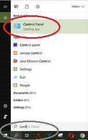 - Cara kedua, untuk mengakses menu seperti gambar di atas bisa juga dengan melalui tombol lup (search) dibagian kiri bawah layar Anda, kemudian ketikkan kata “control panel” di kotak pencarian, setelah itu klik Control Panel Desktop app.