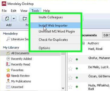 Agar web browser kita bisa menangkap metadata referensi yang tersedia, sekaligus memasukkan ke dalam basis data Mendeley kita, maka kita harus menambahkan plugin yang dinamai oleh programmer Mendeley dengan “Web Importer”. Untuk memasang plugin ini Anda bisa mengikuti langkah-langkah sebagai berikut: