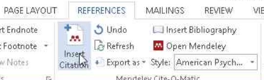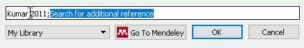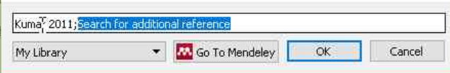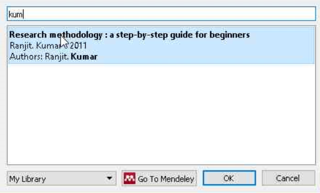 - Setelah muncul menu sitasi Mendeley, ketikkan kata kunci buku yang Anda sitasi kemudian kalau sudah ketemu silahkan klik buku tersebut