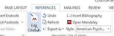 - Klik atau letakkan kursor di referensi yang akan ditambahkan, maka secara otomatis tombol “Insert Citation” akan berubah menjadi “Edit Citation”
