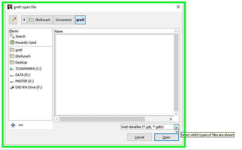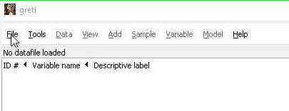 - Buka perangkat lunak gretl Anda, setelah terbuka pilih menu “File” atau tekan “Ctrl+O” di keyboard Anda