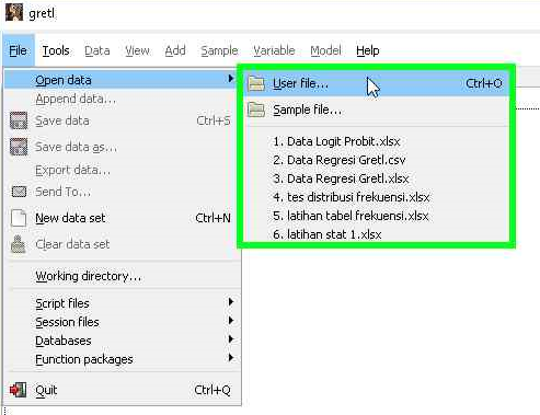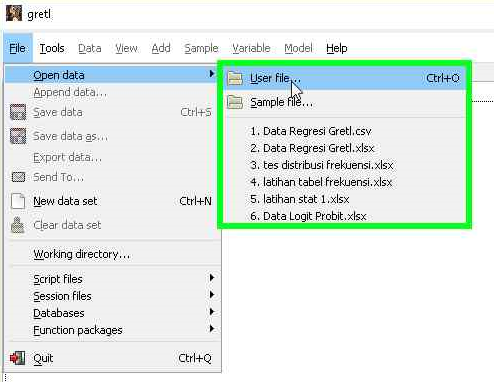 - Buka perangkat lunak gretl kemudian pilih menu “File”
