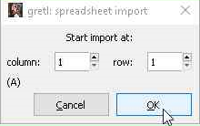 - Selanjutnya gretl akan melakukan konfirmasi “start” impor data dimulai dari sel kolom keberapa dan baris ke berapa. Secara default dimulai dari kolom pertama dan baris pertama. Setelah konfirmasi sudah dianggap benar maka kliklah tombol “Ok”