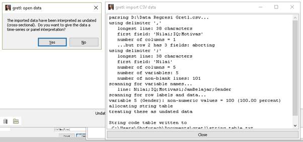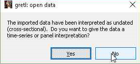 - Gretl kemudian menginformasikan jenis data Anda. Pada contoh ini menurut gretl data yang diimpor adalah data undated atau tanpa tanggal karena memang bukan data runtut waktu (time series) dengan demikian dikategorikan oleh gretl sebagai data cross-section.