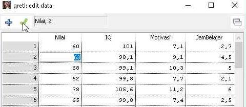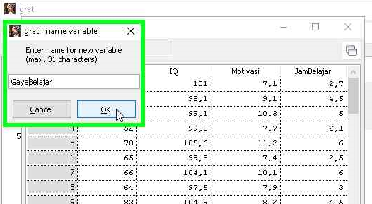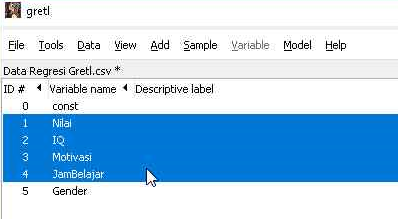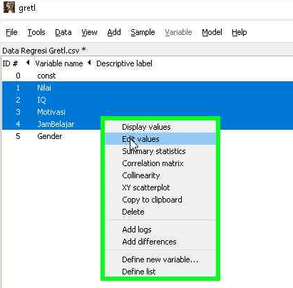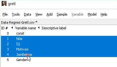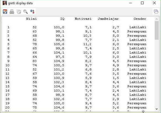 Ketika data sudah berhasil diimpor, kita masih perlu melakukan pengecekan lagi apakah data bisa dibaca dengan baik oleh gretl. Pengecekan ini juga bermanfaat untuk memastikan bahwa tidak ada data yang missing. Menampilkan data untuk melakukan pengecekan dapat dilakukan per variabel atau langsung beberapa variabel. Berikut adalah langkah-langkah menampilkan data secara grup.