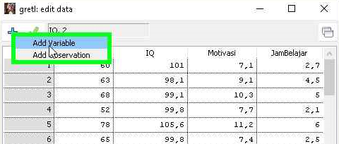 Bila ada variabel baru yang akan dianalisis Anda bisa menambahkan variabel baru. Anda bisa menambahkan variabel baru dengan cara impor data dengan langkah-langkah yang diuraikan di atas, atau dengan menambah secara manual dengan cara-cara sebagai berikut: