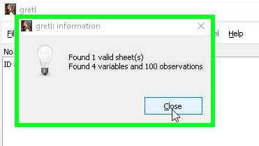- Gretl kemudian akan melakukan konfirmasi kembali bahwa ia menemukan sebuah atau beberapa buah sheet yang valid, juga menemukan jumlah variabel sekaligus jumlah observasi atau sampel. Dalam contoh ini ditemukan satu sheet data yang valid, 4 buah variabel dan 100 observasi