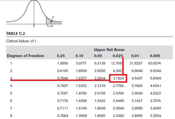 - Pada contoh kali ini kita menggunakan df 3 dan α 5% dua sisi sehingga right-tail probability sebesar 0,025