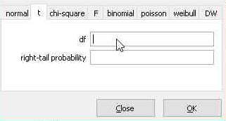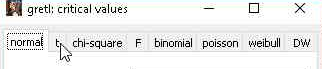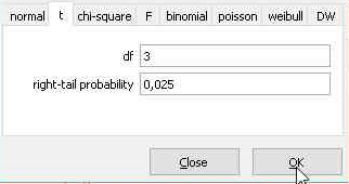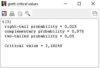 Nilai kritis pada contoh diatas adalah 3,1824. Hasil itu diperoleh dari tabel distribusi t. Untuk memudahkan peneliti gretl sudah menyediakan fasilitas pencarian nilai t tabel (nilai kritis) ini. Sehingga kita tidak perlu lagi membuka tabel distribusi t. kita hanya cukup mengisikan nilai df dan nilai upper-tail area atau di gretl disebut dengan right-tail probability.