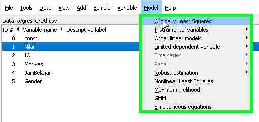 - Pilih menu “Model” pada menu utama di bagian atas tampilan gretl