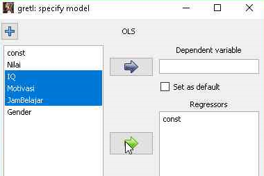 - Masukkan variabel “IQ, Motivasi, dan JamBelajar” sebagai variabel “Independent” caranya dengan memasukkan variabel tersebut satu persatu, atau secara bersamaan. Pilih ketiga variabel tersebut, bila sudah bertanda biru maka klik “tanda panah” berwarna gradasi hijau