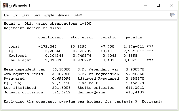 Nilai = -179,043 + 2,28568 IQ + 0,304343 Motivasi + 3,03533 JamBelajar + e