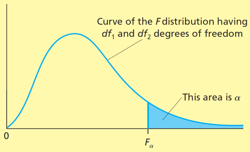 Untuk menggunakan distribusi F, biasanya digunakan titik kritis F, atau biasa disebut dengan F tabel. Seperti pada gambar di atas F adalah titik pada sumbu horizontal di bawah kurva distribusi F yang memisahkan area ekor kurva sebagai daerah penolakan Ho. Nilai Fα atau F tabel dalam situasi tertentu tergantung pada ukuran area ekor kanan (ukuran) dan pada derajat kebebasan pembilang (df1) dan derajat kebebasan penyebut (df2).