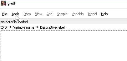 - Buka aplikasi gretl Anda, Setelah terbuka pilih menu “Tools”
