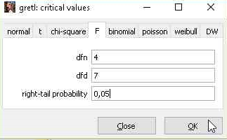 Menggunakan perangkat lunak gretl, kita tidak perlu lagi membuka tabel distribusi F. kita bisa memanfaatkan tool dengan langkah-langkah sebagai berikut: