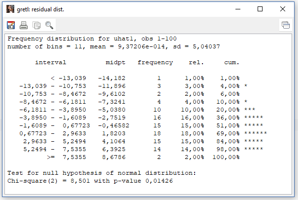 - Seketika akan muncul hasilnya yang terdiri dari dua jendela sekaligus. Jendela pertama adalah tabel distribusi frekuensi dengan interval data yang sudah otomatis dibuatkan oleh gretl