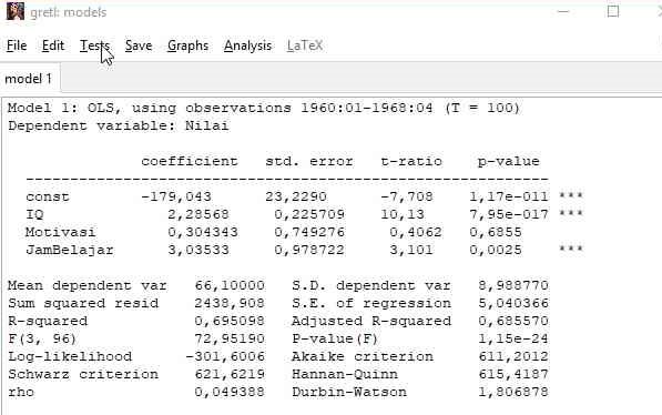- Buka output regresi Anda, kemudian pilih menu “Tests”