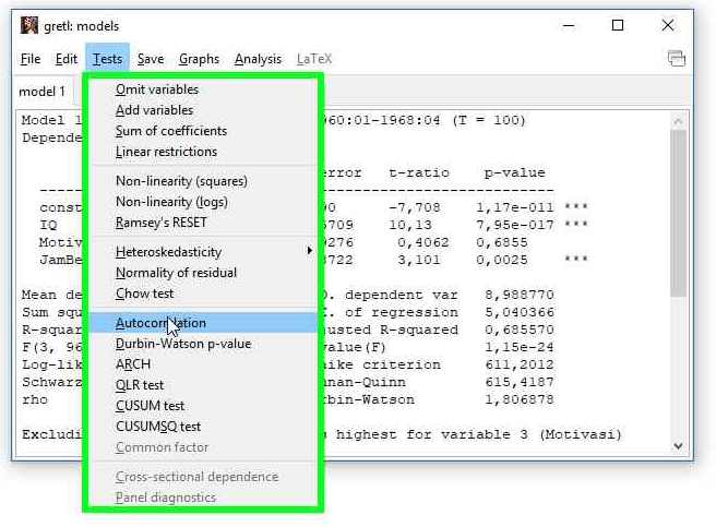Untuk melakukan uji BG ini menggunakan gretl langkahnya sangat mudah. Berikut tahapan pengujian asumsi autokorelasi menggunakan uji BG menggunakan gretl :
