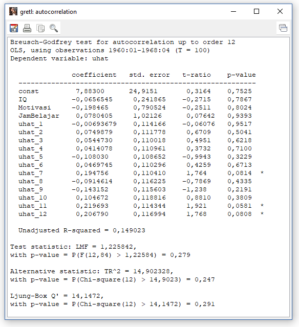 Uji Breusch-Godfrey disebut juga dengan Uji Lagrange-Multiplier (LM-test). Hampir semua aplikasi statistik juga sudah menyediakan uji BG atau LM ini, tak terkecuali gretl. Namun sebelum itu sebaiknya kita pahami dulu bagaimana hipotesis dan kriteria ujinya sebagai berikut: