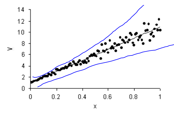 Model regresi seharusnya bebas dari kasus heteroskedastisitas ini. Kondisi yang berlawanan dengan kondisi heteroskedastik disebut dengan kondisi homoskedastik. Artinya varian residual regresi cenderung konstan dalam berpapun nilai Y atau X seperti pada gambar berikut.