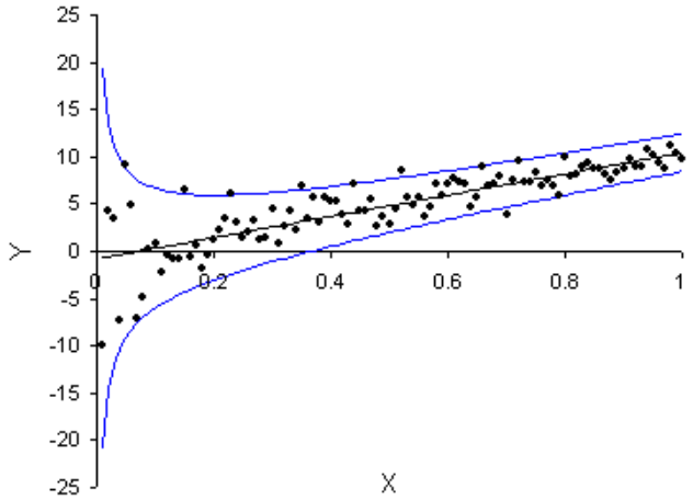 Heteroskedastisitas terjadi ketika kesalahan standar suatu variabel yang dipantau selama waktu atau observasi tertentu tidak konstan. Bila terjadi heteroskedastisitas, tanda pada pengamatan visual (biasanya menggunakan scatter plot) dari residual akan cenderung menyebar seiring waktu atau seiring bertambahnya nilai variabel independen. Pola seperti ini seperti yang digambarkan pada gambar di bawah ini.