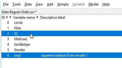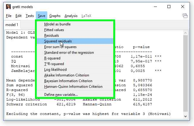 Langkah pertama yang perlu dilakukan adalah dengan membuat data variabel residual kuadrat kemudian dilanjutkan dengan membuat grafik scatter plot nilai residual kuadrat tersebut dengan variabel independennya (X). Misalnya, dalam contoh ini dengan variabel IQ. Berikut langkah-langkahnya dalam gretl.