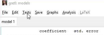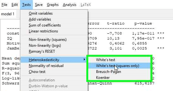 Kembali ke masalah uji white, kita bisa dengan sangat mudah melakukan kedua uji ini di gretl. Langkah-langkahnya sangat sederhana. Kali ini kita akan melakukan uji white (penuh) dan uji white (kuadrat saja).