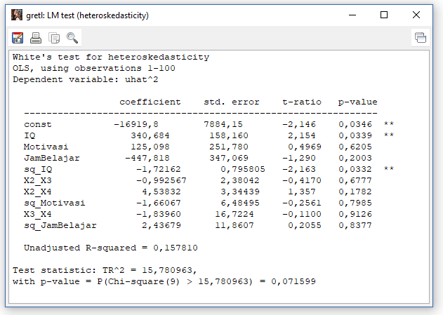 Jika variabel interaksi dimasukkan dalam model uji white, maka uji ini adalah uji gejala heteroskedastisitas sekaligus uji bias spesifikasi. Beruntung para programmer gretl menyediakan keduanya yaitu uji white utuh dan uji white dengan variabel kuadrat saja.