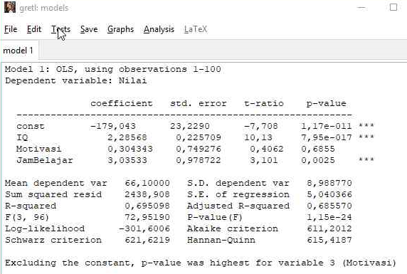 - Buka output regresi Anda di gretl, pilih menu “Tests”