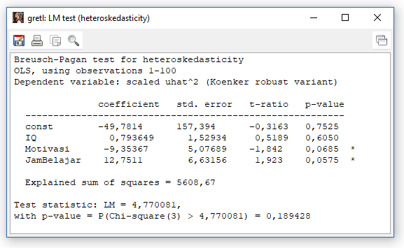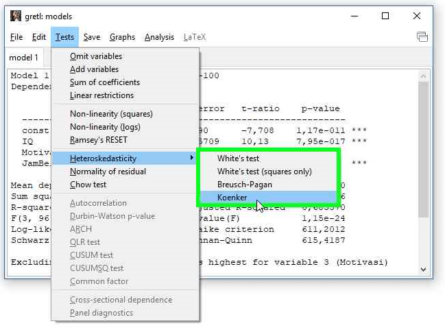 Uji Koenker-Bassett ini sudah disediakan oleh gretl, sehingga kita tidak perlu membuat variabel baru (residual kuadrat) untuk menjalankan uji ini. Berikut langkah-langkah uji heteroskedastisitas model regresi menggunakan gretl: