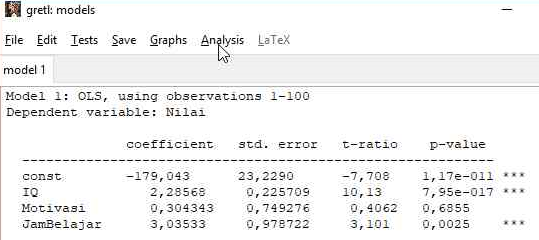 Tentunya akan sangat merepotkan dan membutuhkan waktu yang tidak sebentar bila kita melakukan penghitungan secara manual. Untunglah gretl sudah menyediakan alat uji ini, sehingga hanya dengan beberapa klik kita bisa mendapatkan hasilnya.