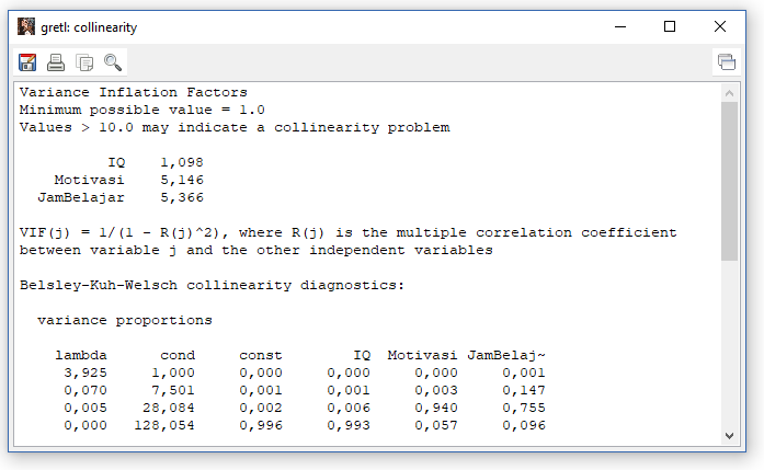 - Output uji VIF gretl seperti pada gambar berikut ini