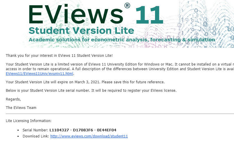 Seperti telah kita bahas pada artikel sebelumnya bahwa Eviews 11 versi gratis (student version) sudah cukup memenuhi untuk digunakan dalam belajar ekonometrika. Nah, di tulisan ini kita akan membahas bagaimana cara download Installer Eviews tersebut dan bagaimana cara mendapatkan nomor serialnya.